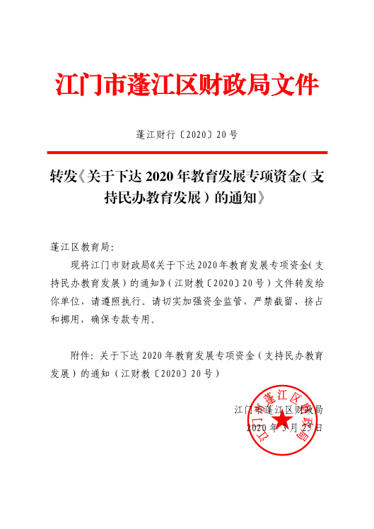 轉(zhuǎn)發(fā)《關(guān)于下達(dá)2020年教育發(fā)展專項(xiàng)資金(支持民辦教育發(fā)展)的通知》