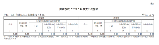 江門市蓬江區(qū)衛(wèi)生健康局(本級)2024年度“三公”經(jīng)費財政撥款支出決算為8.4萬元,完成全年預(yù)算9.1萬元的92.3%,比上年決算數(shù)增加4.6萬元,增長121.1%。其中:因公出國(境)費支出決算為0萬元,完成預(yù)算0萬元的--%(基數(shù)為0,不可比),比上年決算數(shù)增加0萬元,增長--(基數(shù)為0,不可比);公務(wù)用車購置及運行維護(hù)費支出決算為8 . 4萬元,完成預(yù)算8 . 6萬元的97.6%,比上年決算數(shù)增加4.6萬元,增長121.1%;其中:公務(wù)用車購置支出決算為0萬元,完成預(yù)算0萬元的--%(基數(shù)為0,不可比),比上年決算數(shù)增加0萬元,增長--(基數(shù)為0,不可比);公務(wù)用車運行維護(hù)費支出決算為8.4萬元,完成預(yù)算8.6萬元的97.6%,比上年決算數(shù)增加4.6萬元,增長121.1%;公務(wù)接待費支出決算為0萬元,完成預(yù)算0.5萬元的0%,比上年決算數(shù)增加0萬元,增長--(基數(shù)為0,不可比)。
