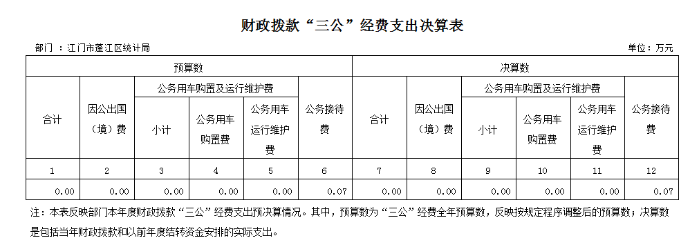 江門市蓬江區(qū)統(tǒng)計(jì)局2024 年度“三公”經(jīng)費(fèi)財(cái)政撥款支出決算為0.07萬(wàn)元,完成全年預(yù)算0.07萬(wàn)元的100%(基數(shù)為0,不可比) 。其中:因公出國(guó)(境)費(fèi)支出決算為0 萬(wàn)元,完成預(yù)算0 萬(wàn)元的--%(基數(shù)為0,不可比) ;公務(wù)用車購(gòu)置及運(yùn)行費(fèi)支出決算為0 萬(wàn)元,完成預(yù)算0 萬(wàn)元的--%(基數(shù)為0,不可比) ;公務(wù)接待費(fèi)支出決算為0.07 萬(wàn)元,完成預(yù)算0.07萬(wàn)元的100%(基數(shù)為0,不可比) 。