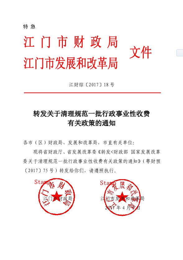 轉(zhuǎn)發(fā)關(guān)于清理規(guī)范一批行政事業(yè)性收費(fèi)有關(guān)政策的通知 江財(cái)綜[2017]18號(hào)