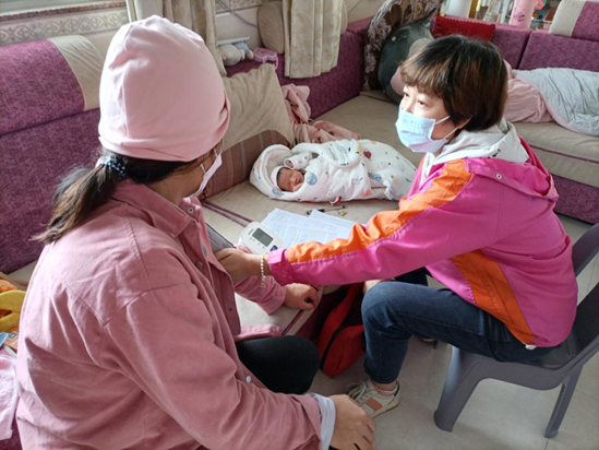春節(jié)期間,她如約來到杜阮鎮(zhèn)杜臂村,訪視出院后一周內(nèi)的李女士,為新生兒進(jìn)行體測、肚臍消毒處理、臀部護(hù)理、喂養(yǎng)指導(dǎo)、沐浴指導(dǎo)、接種指導(dǎo)等,又為產(chǎn)婦進(jìn)行體測、乳汁分泌和宮縮情況檢查、切口消毒、產(chǎn)后膳食營養(yǎng)指導(dǎo)等。