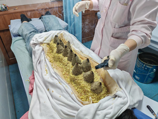 在荷塘鎮(zhèn)衛(wèi)生院中醫(yī)館里,幾張治療床全部客滿。其中,一半以上都是來做姜療的。容女士長時間待在空調(diào)房,肩膀頸椎倍感不適,慕名前來治療。俯臥在治療床上,容女士脊柱上鋪滿生姜,生姜上的艾絨緩緩燃燒,青煙裊裊升起,溫暖徐徐滲透。第一次嘗試姜療的容女士,對此贊不絕口。