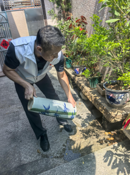 蓬江區(qū)紅十字志愿服務(wù)隊(duì)下沉一線,包村聯(lián)戶,與農(nóng)村、社區(qū)“兩委”干部聯(lián)合作戰(zhàn),全力以赴打贏疫情殲滅戰(zhàn)。通過串小巷、進(jìn)家庭,向居民派發(fā)防控宣傳單,協(xié)助居民檢查住所周邊的花盆托盤、水桶、水缸等容器,進(jìn)行翻盆倒罐,面對面講解基孔肯雅熱的傳播途徑、癥狀及預(yù)防方法,提醒居民做好日常防蚊措施,保持環(huán)境整潔,做好個(gè)人防護(hù)。