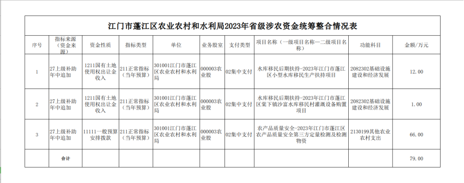 我局2023年省級(jí)涉農(nóng)資金統(tǒng)籌整合項(xiàng)目共3個(gè),合計(jì)79萬元?,F(xiàn)將相關(guān)項(xiàng)目及資金情況予以公示: