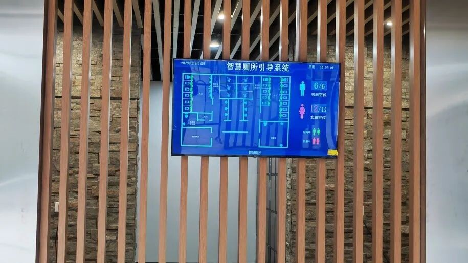 一樓智慧公廁引導(dǎo)系統(tǒng)大屏幕上,男女衛(wèi)生間空閑蹲位等信息一目了然