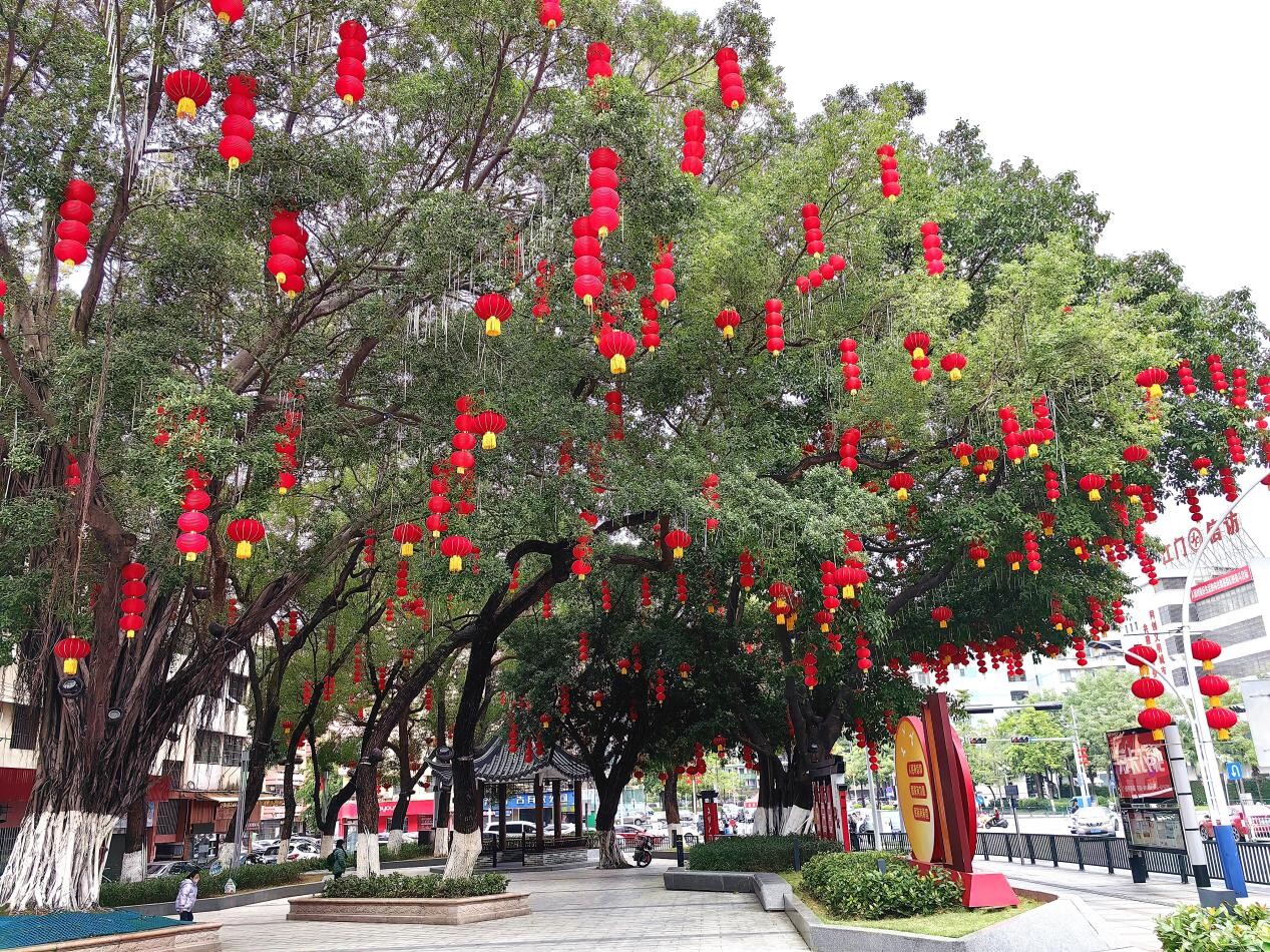 一串串火紅的燈籠懸掛在樹枝上,隨風(fēng)擺動(dòng),處處一派熱鬧的節(jié)日氛圍,吸引路人駐足觀看。