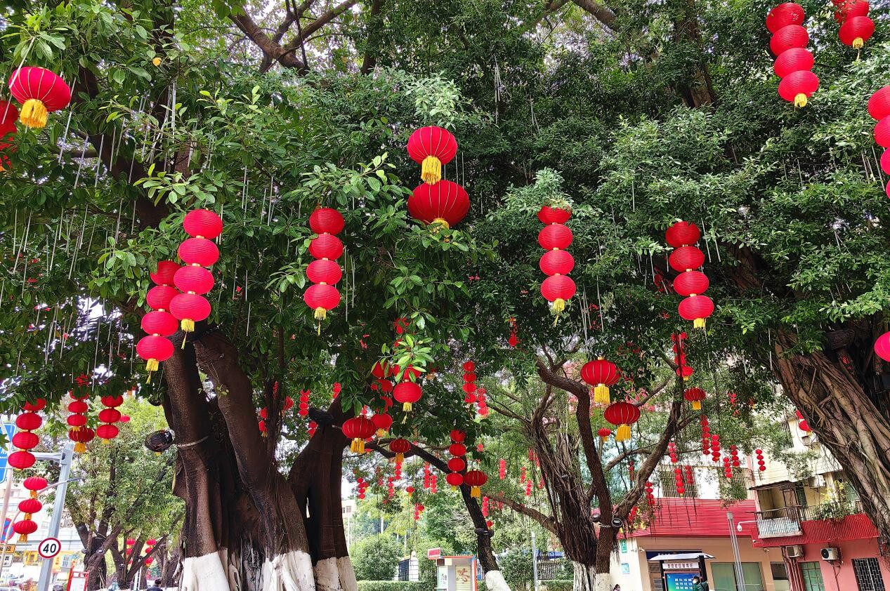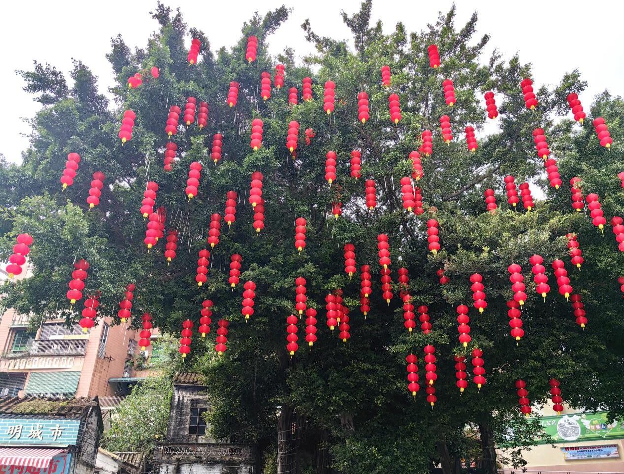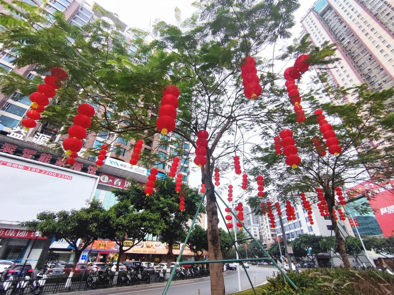 一個(gè)個(gè)紅燈籠悄然地爬上樹梢,為蓬江街頭增添春節(jié)氣息