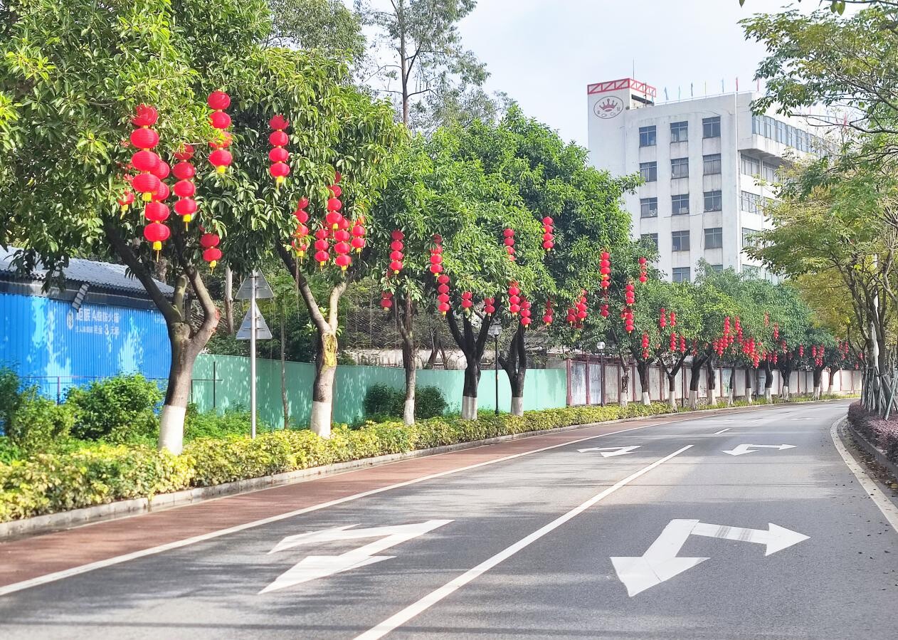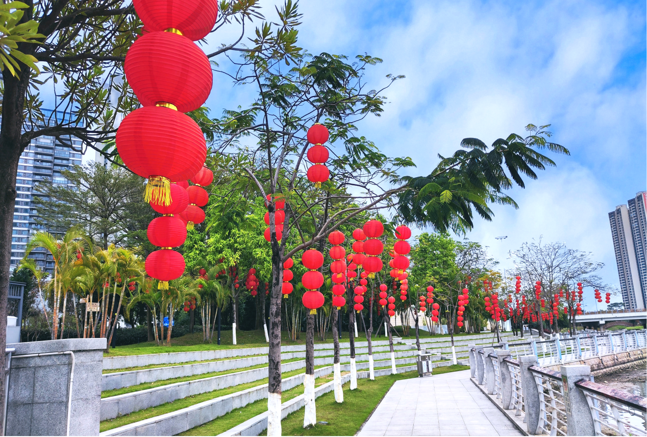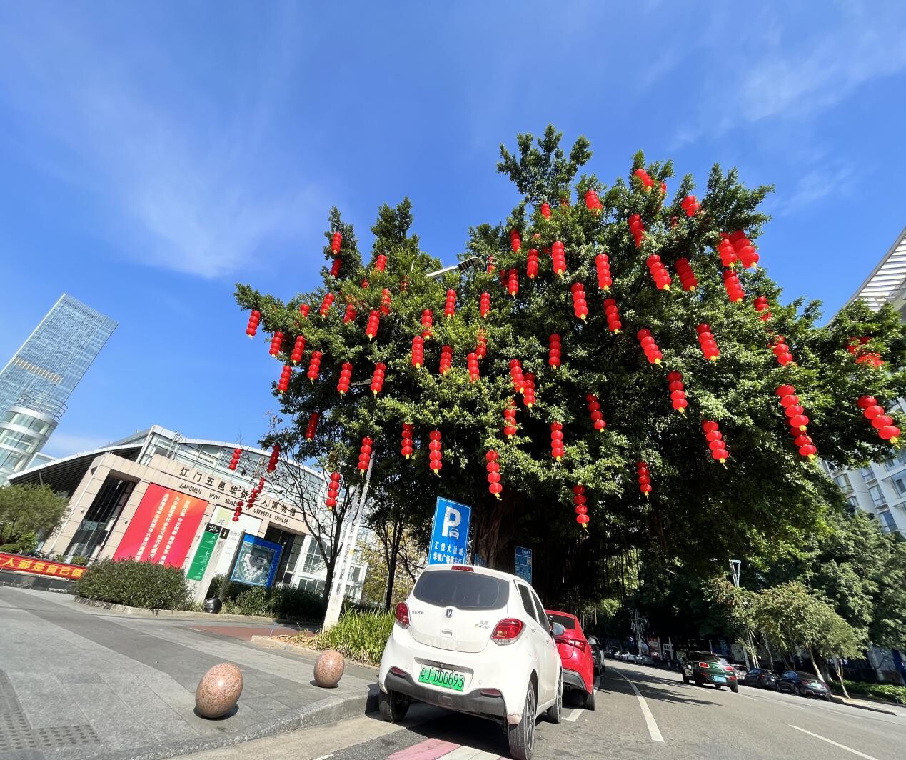 一個(gè)個(gè)紅燈籠悄然地爬上樹梢,為蓬江街頭增添春節(jié)氣息