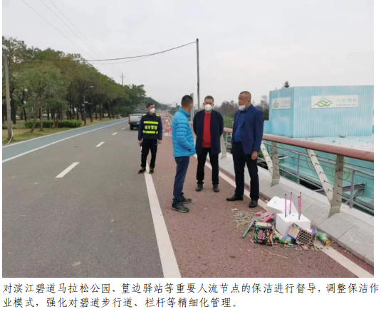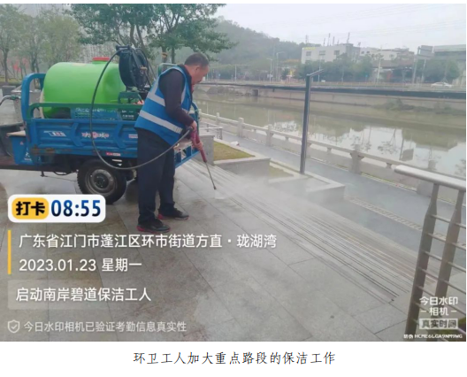 1月21日至27日,蓬江城市管理和綜合執(zhí)法局對(duì)城區(qū)主次干道、濱江大道、三鎮(zhèn)一街、碧道、公園出動(dòng)巡查和管理人員約1000人次,車輛約70臺(tái)次,日均出動(dòng)環(huán)衛(wèi)工人約2500人,日均出動(dòng)養(yǎng)護(hù)車、三輪電動(dòng)保潔車等各式環(huán)衛(wèi)車輛約900臺(tái),日均清理明渠約100條,累計(jì)清運(yùn)生活垃圾約5000噸。