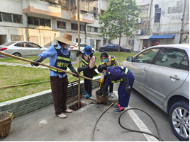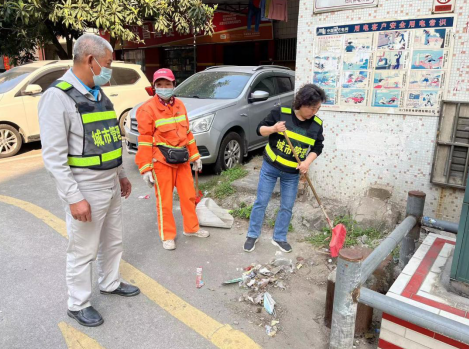 彭鳳娟溝通指導(dǎo)屬地環(huán)衛(wèi)工人清理衛(wèi)生死角