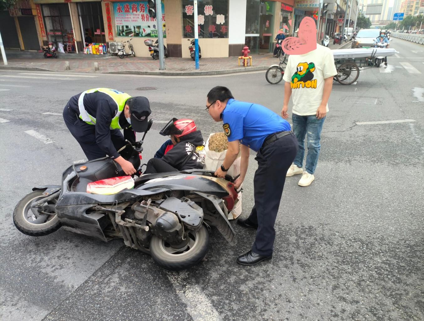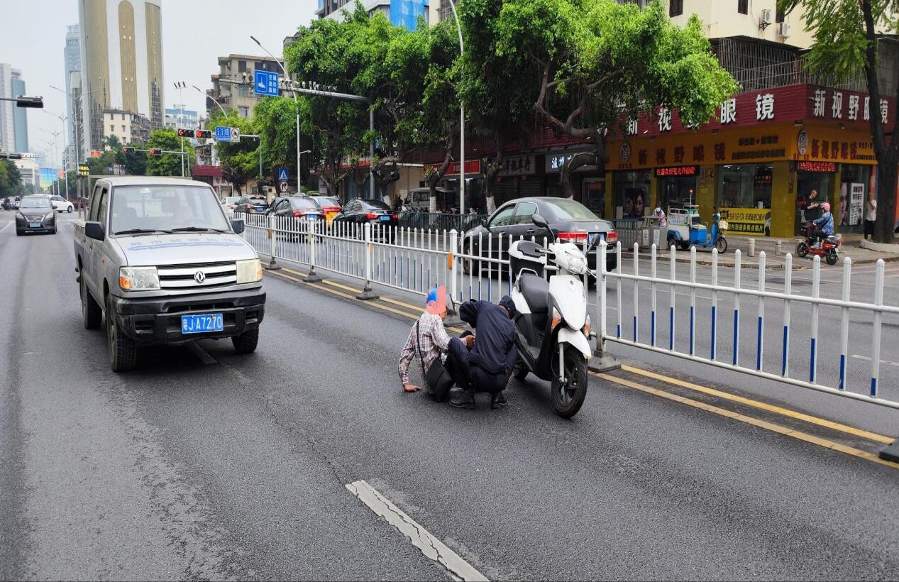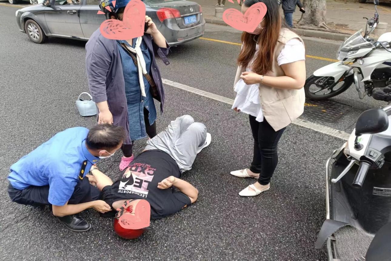 同一時(shí)間,暖心的一幕也在另一頭上演著。另一組隊(duì)員梁健能在值守遠(yuǎn)航市場期間,巡查至永盛二路,發(fā)現(xiàn)一女子駕駛摩托車發(fā)生交通事故。
