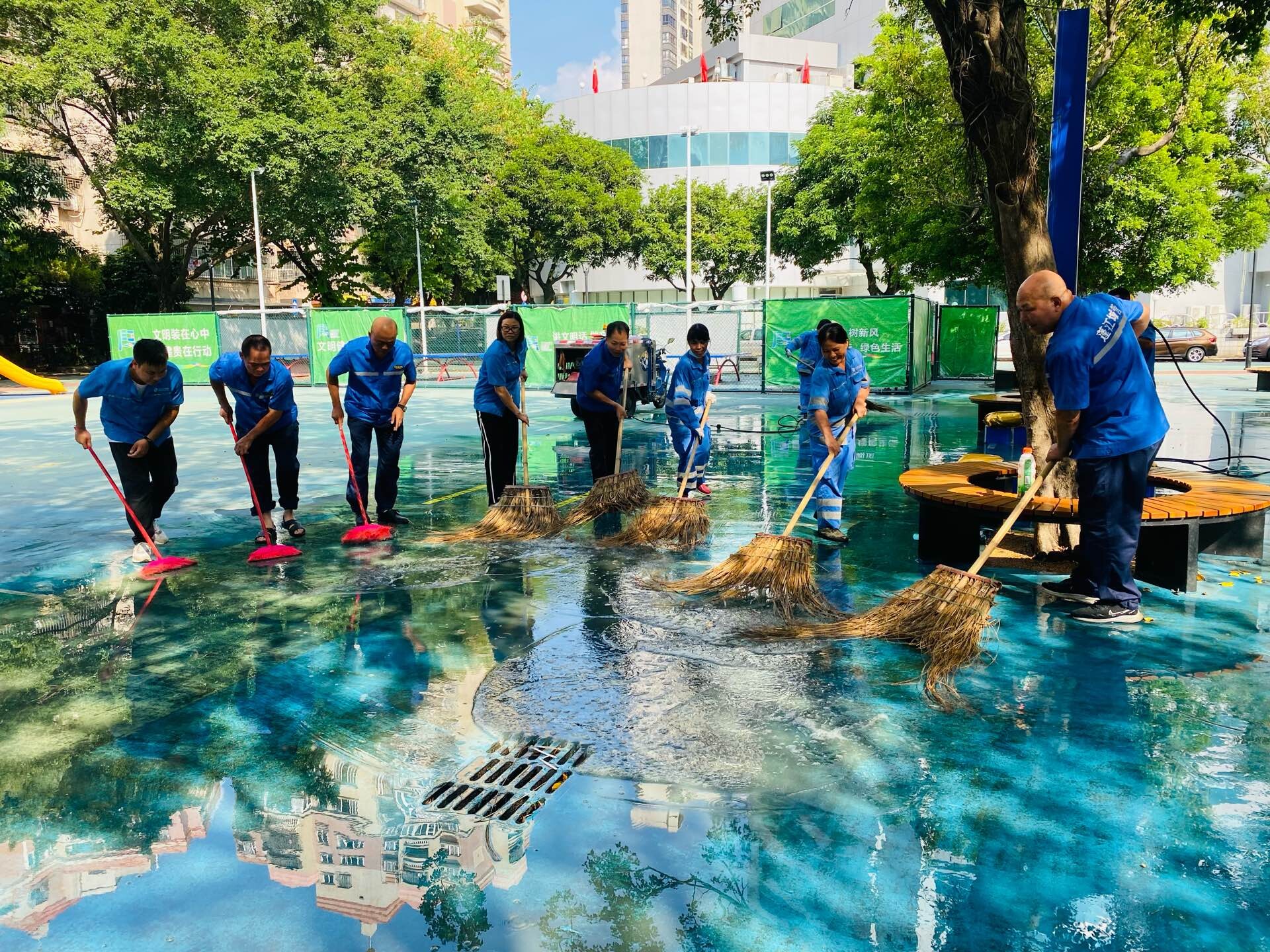 環(huán)衛(wèi)中心帶領(lǐng)環(huán)衛(wèi)工人對陳垣廣場、潮連文化廣場等開展節(jié)前清洗,通過清潔路面、擦拭石凳、清理廢品等,讓廣場煥然一新。