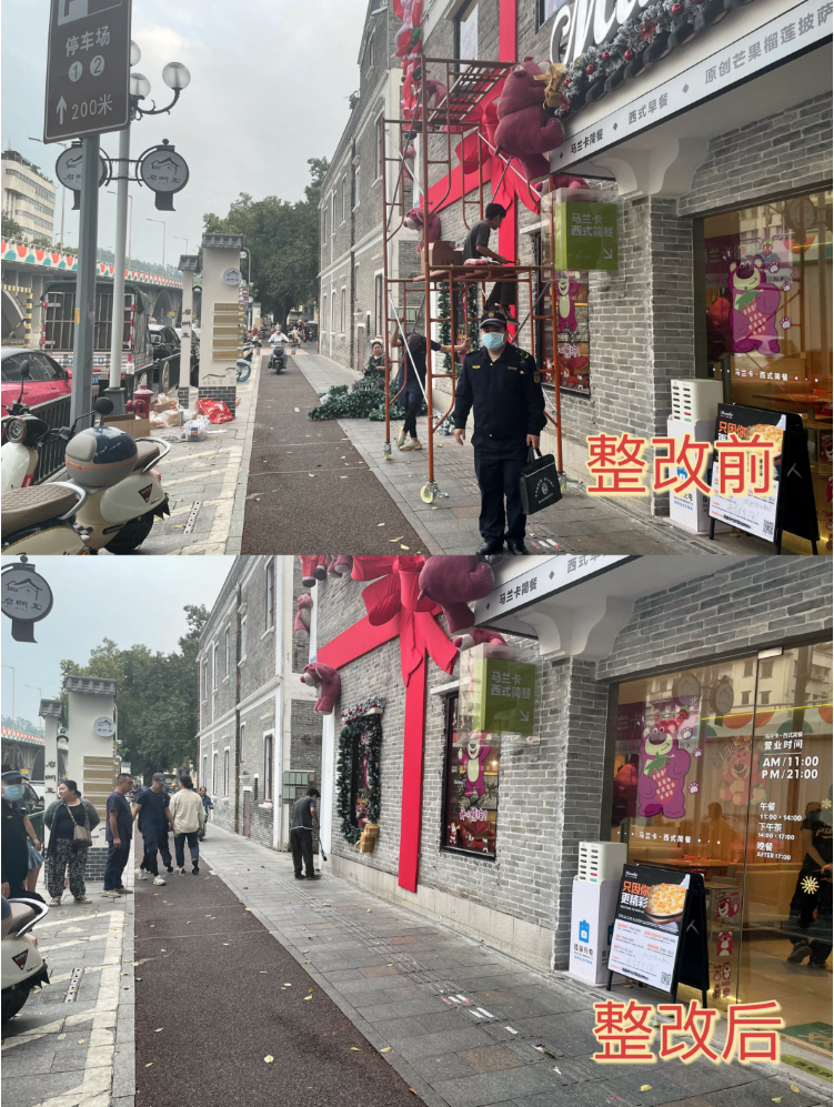 15分鐘后,該局執(zhí)法人員到達現(xiàn)場核查,發(fā)現(xiàn)其行為并未獲得施工許可,現(xiàn)場責令停止作業(yè)進行整改并清理遺留垃圾,確保店鋪前環(huán)境整潔?!俺枪懿块T到場非常迅速,處理效率也很高,切實保障了群眾安全和公共秩序”。居住在附近的王先生說。