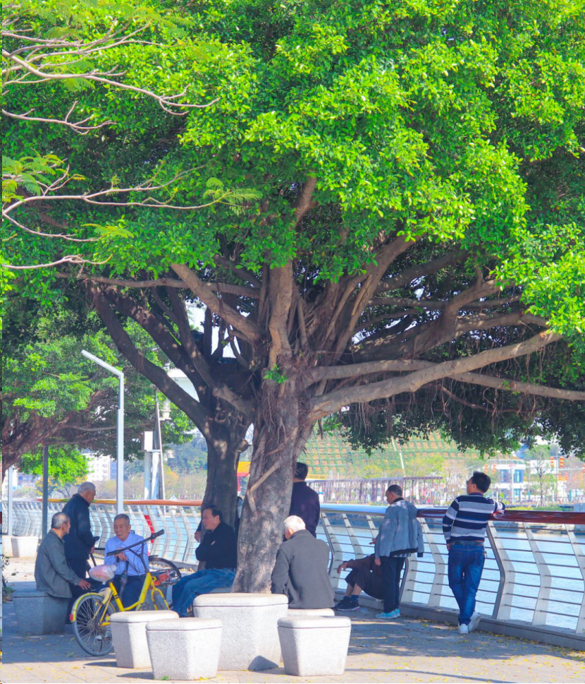 三三兩兩的居民,聚在樹蔭下聊家常,