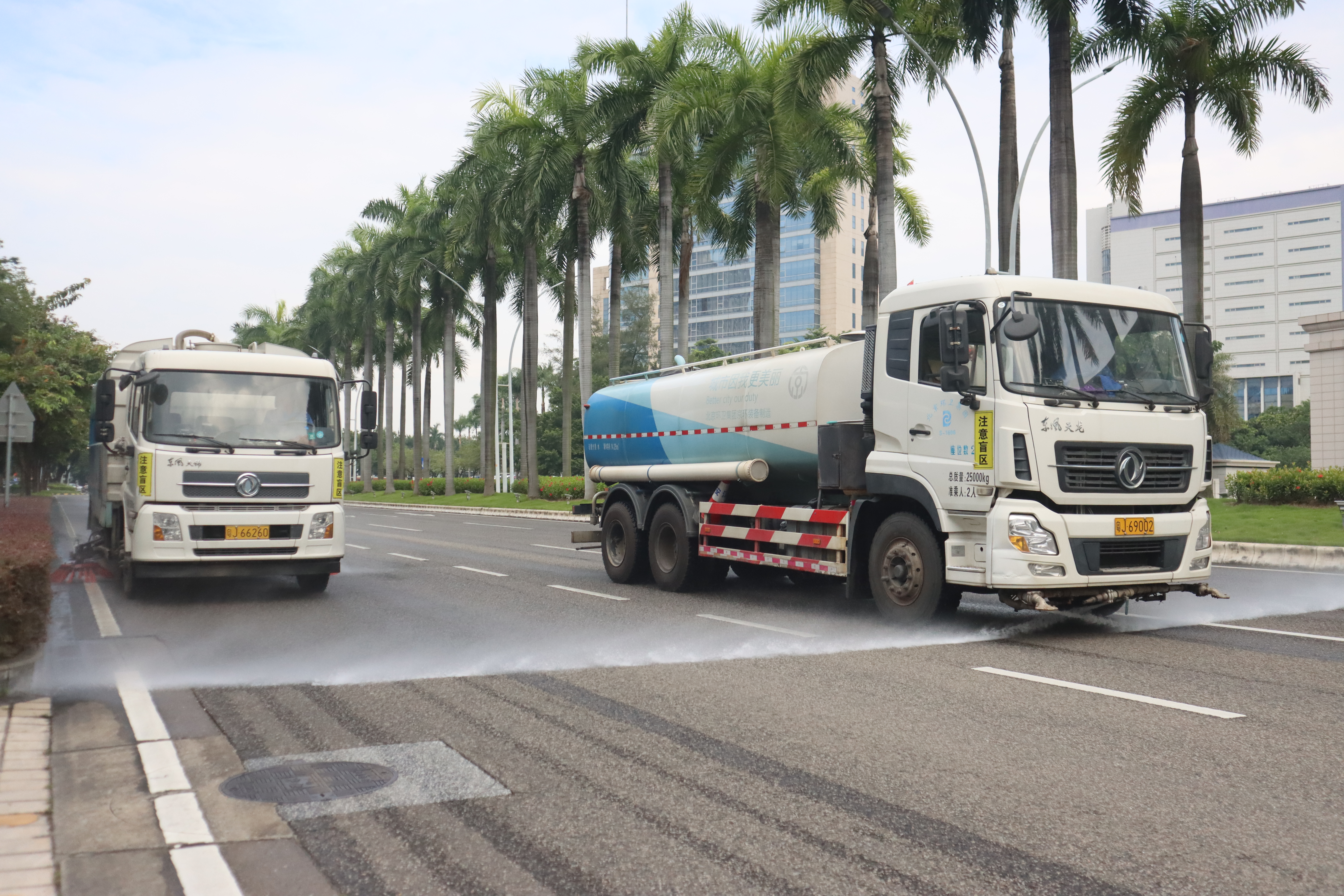 除了常態(tài)化清潔作業(yè),灑水作業(yè)時間、頻次會隨著溫度變化、空氣狀況進(jìn)行調(diào)整。在高溫天氣里,會增加灑水車配置和重點(diǎn)道路灑水頻次,增加路面濕潤程度;在空氣質(zhì)量不佳的天氣里,會延長作業(yè)時間,加大灑水頻次,增加使用霧炮車、洗掃車、步道車等車輛配合開展作業(yè)。