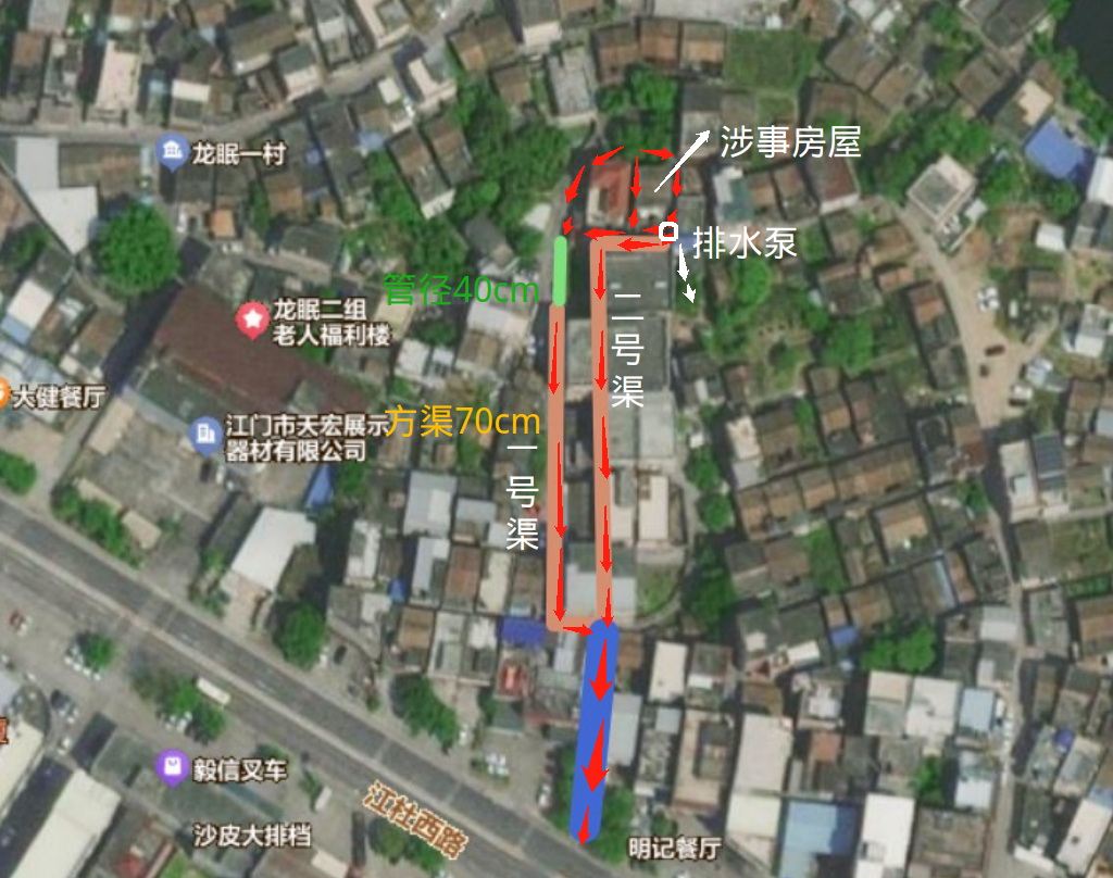 蓬江區(qū)城市管理和綜合執(zhí)法局專業(yè)技術(shù)人員憑借豐富的排澇經(jīng)驗(yàn),迅速鎖定問(wèn)題的關(guān)鍵所在,發(fā)現(xiàn)水浸房屋周邊分布著兩條排水渠。其中1號(hào)渠存在70cm的大管直接接入40cm的小管,突發(fā)暴雨情況下容易造成排水不暢,形成水浸點(diǎn)。2號(hào)渠則是多年未清疏,管底淤積泥沙深約20cm,導(dǎo)致排水不暢的原因之一。