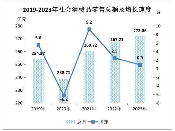全年社會消費(fèi)品零售總額272.06億元,比上年增長0.9%。其中,限上批發(fā)和零售業(yè)零售額139.33億元,下降5.1%;限上住宿和餐飲業(yè)零售額14.34億元,增長18.3%。
