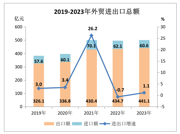 全年外貿(mào)進(jìn)出口總額501.7億元,比上年增長1.1%。其中,進(jìn)口60.6億元,下降2.5%;出口總額441.1億元,增長1.6%。實(shí)際利用外資1.9億元,下降41.8%。
