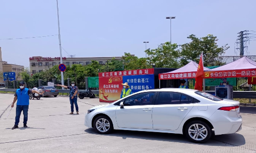 上圖為荷塘填退役軍人容玉輝在對(duì)??寇囕v上的人員查看粵康碼和行程卡