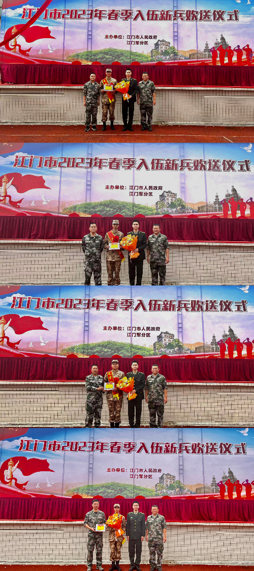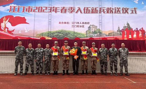 2023年3月15日,荷塘鎮(zhèn)委委員、武裝部部長(zhǎng)、退役軍人服務(wù)站站長(zhǎng)譚俊鋒,荷塘鎮(zhèn)武裝部副部長(zhǎng)、退役軍人服務(wù)站副站長(zhǎng)王偉國(guó)帶上慰問(wèn)品,與今年應(yīng)征入伍新兵家屬及各村(居)民兵連長(zhǎng)一同到江門(mén)市國(guó)防教育基地,參加2023年春季新兵入伍歡送儀式兵儀。“我是中國(guó)人民解放軍軍人,我宣誓……”全體新兵對(duì)著鮮艷的軍旗,高舉右拳進(jìn)行莊嚴(yán)宣誓,他們帶著家鄉(xiāng)人民的祝福與期盼,精神抖擻地踏上火熱的軍旅生活。